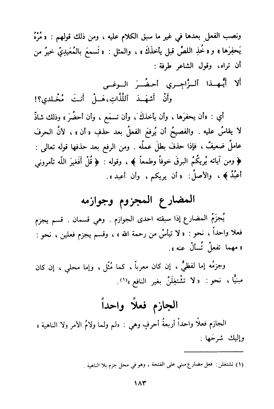 يُجزَمُ المضارع اذا سبقته احدى الجوازم. وهي قسمان. قسم يجزم فعلا واحداً، نحو "لا تيأسْ من رحمة الله"، وقسم يجزم فعلين، نحو "مهما تفعلْ تُسألْ عنه".