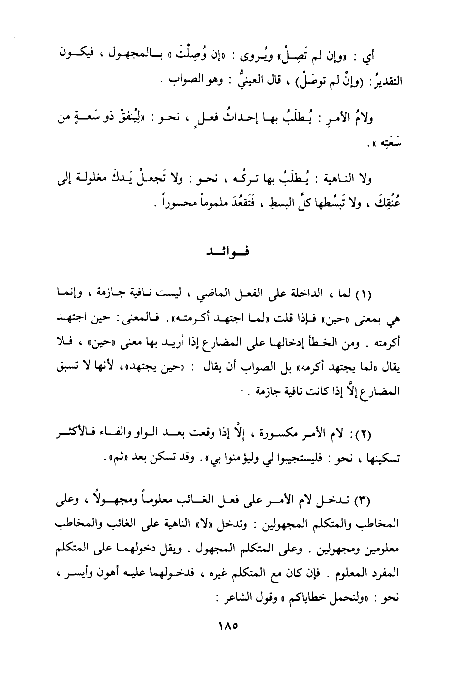 (3) تدخل لام الأمر على فعل الغائب معلوماً ومجهولاً، وعلى المخاطب والمتكلم المجهولين وتدخل "لا الناهية على الغائب والمخاطب معلومين ومجهولين. وعلى المتكلم المجهول. ويقل دخولهما على المتكلم المفرد المعلوم. فإن كان مع المتكلم غيره، فدخولهما عليه أهون وأيسر، نحو "ولنحمل خطاياكم" وقول الشاعر [من الطويل]