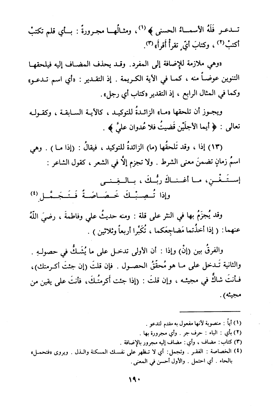 تدعوا فَلَهُ الأسماءُ الحسنى} ، ومثالُها مجرورةً بأي قلم تكتبْ أكتبْ، وكتابَ أيٍّ تقرأْ أَقرأْ".