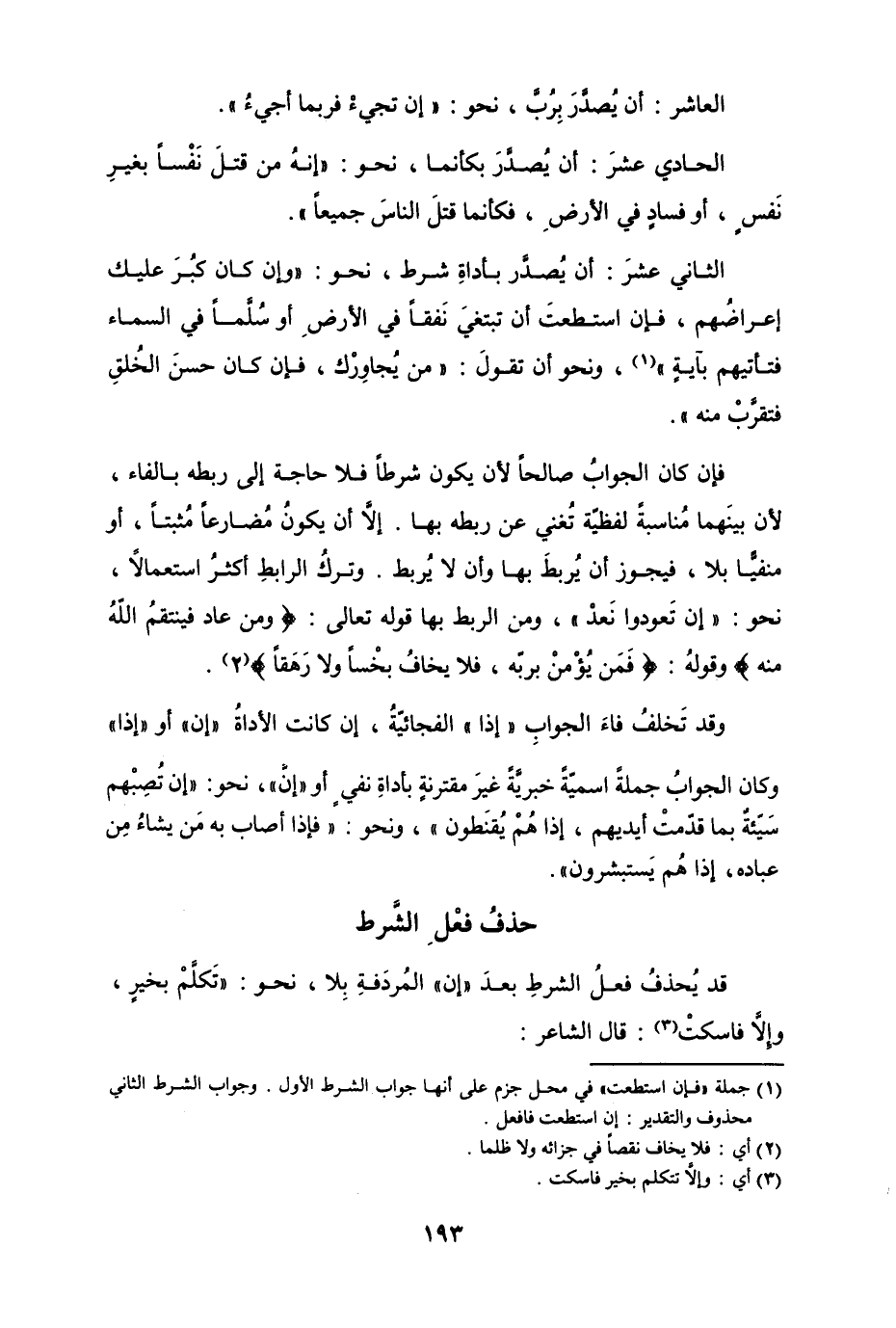 الثاني عشرَ أن يُصدَّر بأداةِ شرط، نحو {وإن كان كبُرَ عليك إعراضُهم، فإن استطعتَ أن تبتغيَ نَفقاً في الأرضِ أو سُلَّماً في السماء فتأتيهم بآيةٍ} ، ونحو أَن تقولَ من يُجاوِرْك، فإن كان حسنَ الخُلقِ فتقرَّبْ منه".