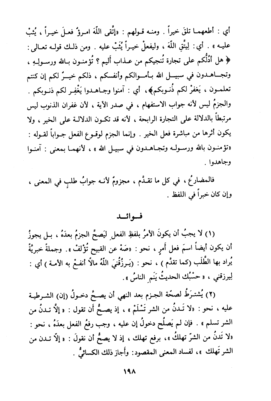 أَي أَطعهما تلقَ خيراً. ومنه قولهم "إتَّقى اللهَ امرؤٌ فعلَ خيراً، يُثبْ عليه". أي لِتَّقِ اللهَ، وليفعلْ خيراً يُثَبْ عليه. ومن ذلك قوله تعالى {هل أدُلُّكم على تجارة تُنجيكم من عذاب أَليم؟ تُؤمنو بالله ورسولهِ، وتجاهدون في سبيل الله بأموالكم وأنفسكم، ذلكم خيرٌ لكم إن كنتم تعلمون، يَغفرْ لكم ذُنوبكم} ، أَي آمنوا وجاهدوا يَغْفر لكم ذنوبكم. والجزمُ ليس لأنه جواب الاستفهام، في صدر الآية، لأن غفران الذنوب ليس مرتبطاً بالدلالة على التجارة الرابحة، لأنه قد تكون الدلالة على الخير، ولا يكون أثرها من مباشرة فعل الخير. وإنما الجزم لوقوع الفعل جواباً لقوله {تؤمنون بالله ورسوله وتجاهدون في سبيل الله} ، لأنهما بمعنى آمنوا وجاهدوا.