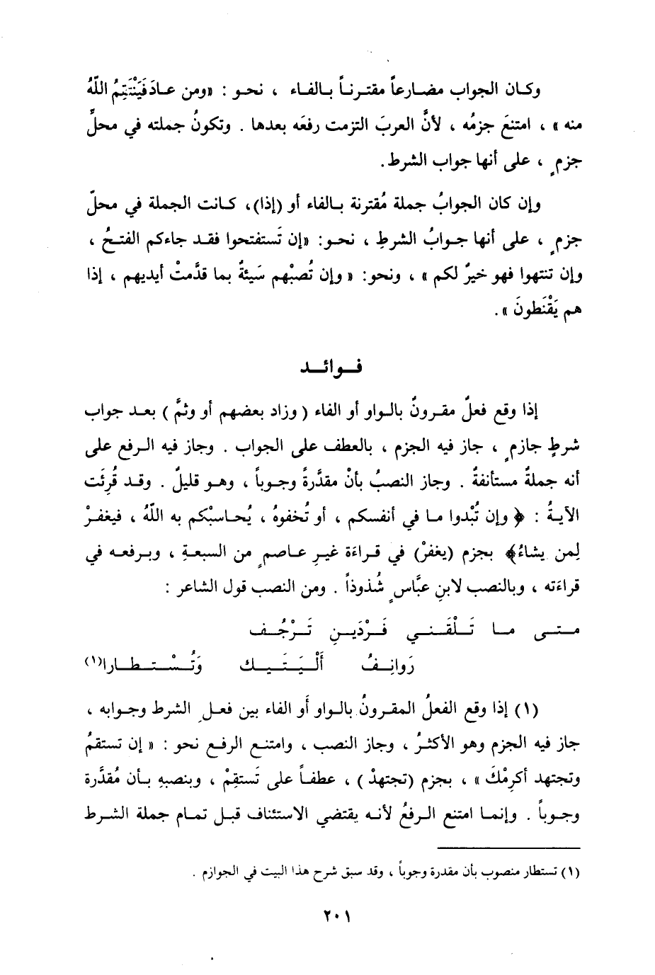 اذا وقع فعلٌ مقرونٌ بالواو أو الفاء (وزاد بعضهم أو وثمَّ) بعد جواب شرطٍ جازمٍ، جاز فيه الجزم، بالعطف على الجواب. وجاز فيه الرفع على أنه جملةٌ مستأنفةٌ. وجاز النصبُ بأنْ مقدَّرةً وجوباً، وهو قليلٌ. وقد قُرِئَت الآيةُ {وان تُبْدوا ما في أنفسكم، أو تُخفوهُ، يُحاسبْكم به اللهُ، فيغفرْ لِمن يشاءُ} ، يجزم (يغفرْ) في قراءَة غيرِ عاصمٍ من السبعةِ، وبرفعه في قراءَته، وبالنصب لابنِ عبَّاسٍ شُذوذاً. ومن النصب قول الشاعر [من الوافر]