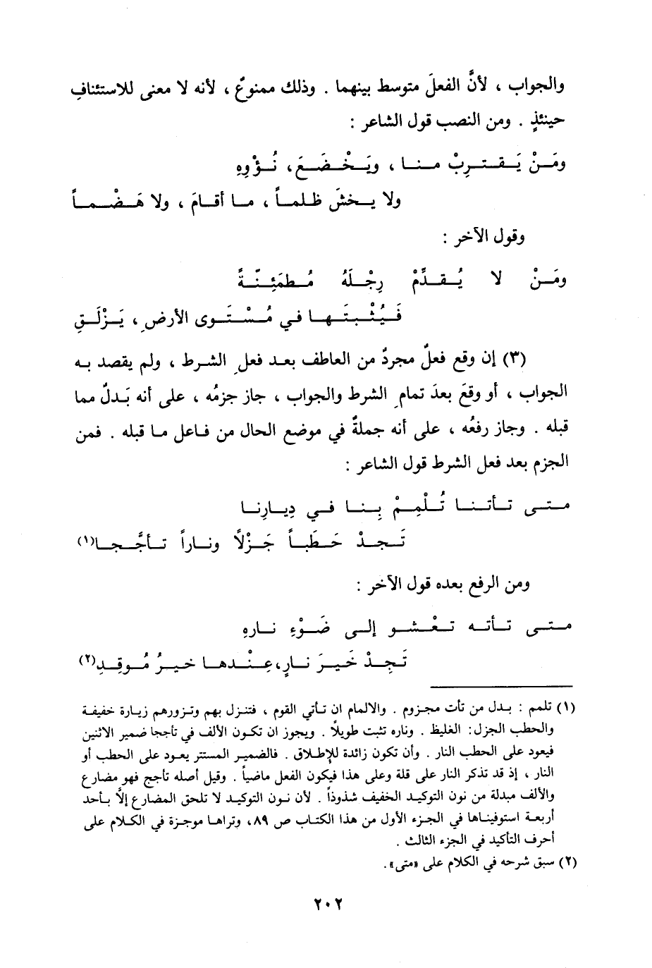 (3) ان وقع فعلٌ مجردٌ من العاطف بعد فعلِ الشرط، ولم يقصد به الجواب، أَو وقعَ بعدَ تمامِ الشرط والجواب، جاز جزمُه، على أنه بَدلٌ مما قبله. وجاز رفعُه، على أَنه جملةٌ في موضع الحال من فاعل ما قبله. فمن الجزم بعد فعل الشرط قول الشاعر [من الطويل]
