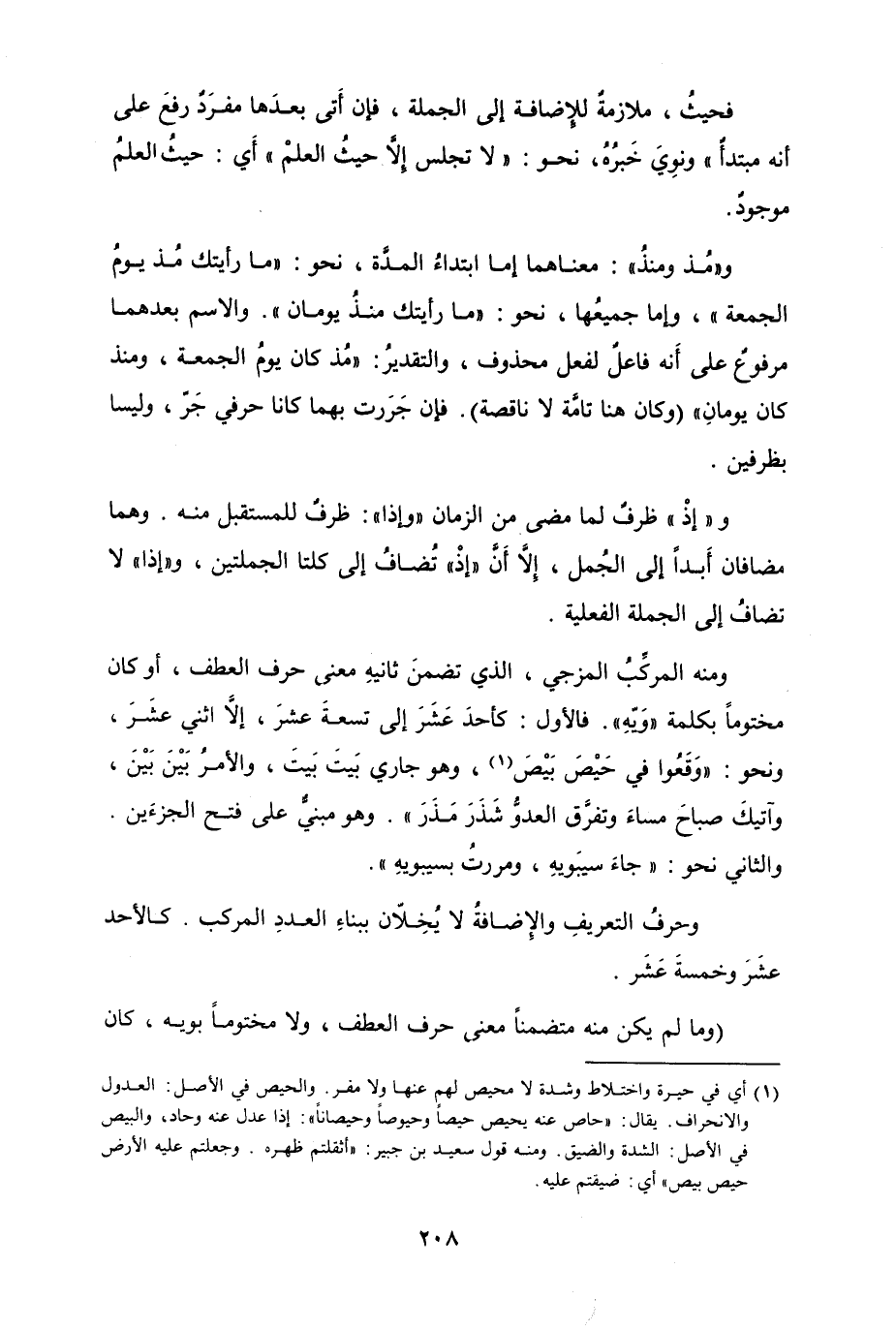 فحيثُ، ملازمةٌ للاضافة إلى الجملة، فإن أَتى بعدَها مفرَدٌ رفعَ على أَنه مبتدأٌ" ونوِيَ خَبرُهُ، نحو "لا تجلس إلاّ حيثُ العلمْ" أَي حيثُ العلمُ موجودٌ.