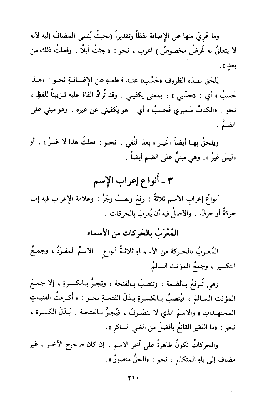وهي تُرفعُ بالضمة، وتنصبُ بالفتحة، وتجرُّ بالكسرةِ، إِلا جمعَ المؤنث السالمَ، فيُنصبُ بالكسرةِ بدَلَ الفتحةِ، نحو "أَكرمتُ الفتياتِ المجتهداتِ" والاسمَ الذي لا ينصَرفُ، فيُجرُّ بالفتحة، بَدَل الكسرة، نحو "ما الفقير القانعُ بأفضلَ من الغني الشاكرِ".
