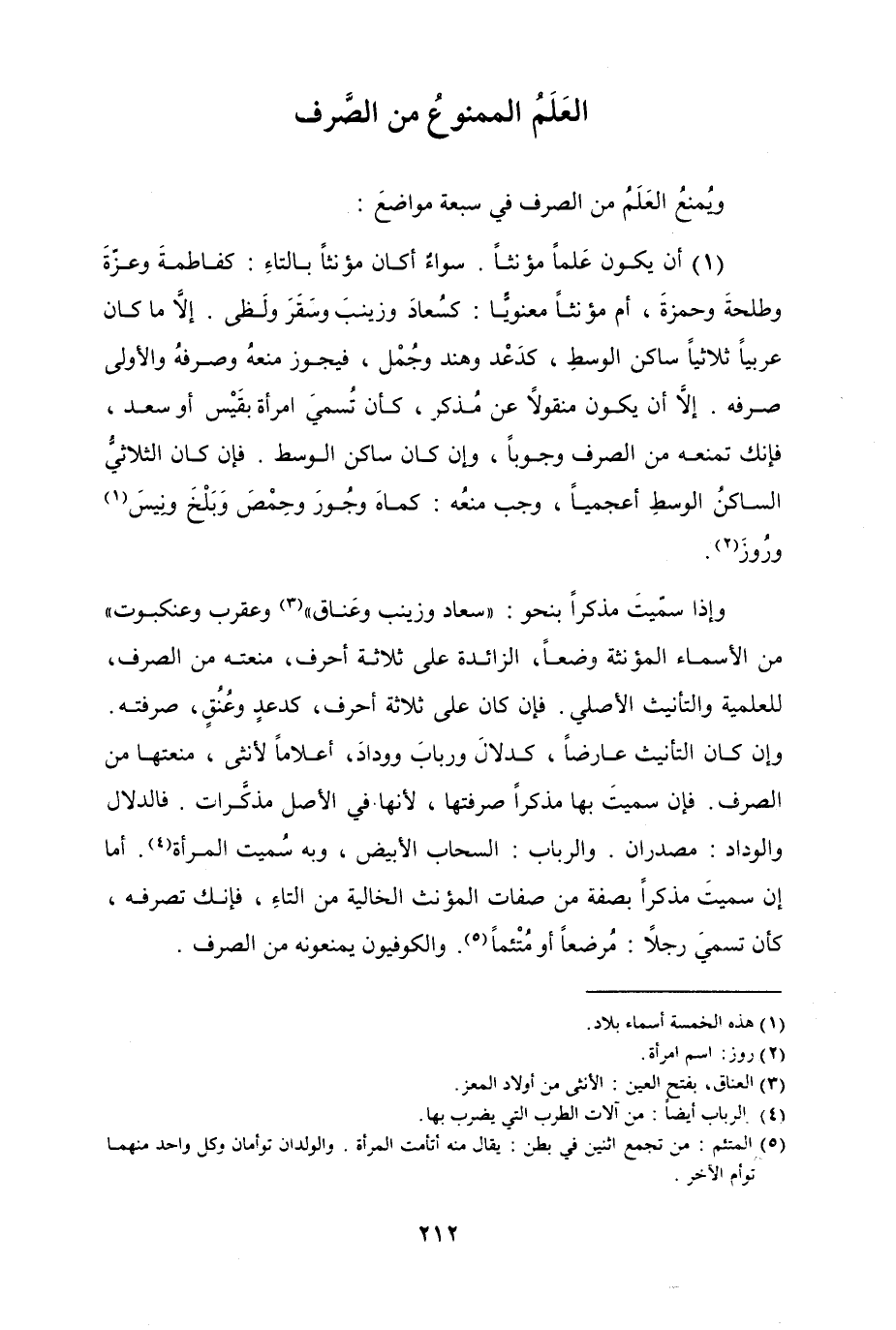(1) أن يكون عَلماً مؤنثاً. سواءٌ أكان مؤنثاً بالتاءِ كفاطمةَ وعزّةَ وطلحةَ وحمزةَ، أم مؤنثاً معنويًّا كسُعادَ وزينبَ وسَقَرَ ولَظى. إلا ما كان عربياً ثلاثياً ساكن الوسطِ، كدَعْد وهند وجُمّل، فيجوز منعهُ وصرفهُ والأولى صرفه. إلا أن يكون منقولاً عن مُذكر، كأن تُسميَ امرأة بقَيّس أو سعد، فإنك تمنعه من الصرف وجوباً، وإن كان ساكن الوسط. فإن كان الثلاثيُّ الساكنُ الوسطِ أعجمياً، وجب منعُه كماهَ وجُورَ وحِمْصَ وبَلْخَ ونِيسَ ورُوزَ.
