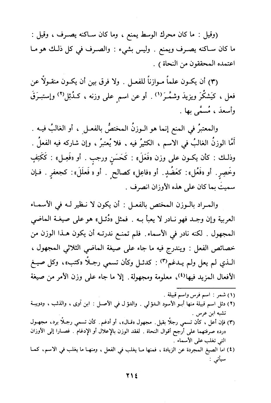 (3) أن يكون عَلماً موازناً للفعل. ولا فرقَ بين أن يكون منقولاً عن فعل، كيَشكُرَ ويزيدَ وشمَّرَ. أو عن اسمٍ على وزنه، كدُئِل وإستبرَقَ واسعدَ، مُسمَّى بها.
