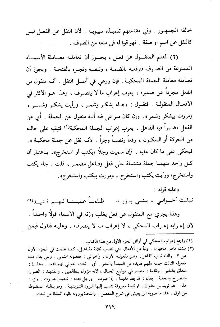 (2) العلم المنقول عن فعل، يجوز أَن تعامله معاملة الأسماء الممنوعة من الصرف فترفعه بالضمة، وتنصبه وتجره بالفتحة. ويجوز أَن تعامله معاملة الجملة المحكية. فإن روعي في أَصل النقل. أَنه منقول من الفعل مجرداً عن ضميره، يعرب إِعراب ما لا ينصرف، وهذا هو الأكثر في الأفعال المنقولة. فتقول "جاء يشكر وشمر، ورأيت يشكر واشمر، ومررت بيشكر وشمر". وإن كان مراعى فيه أَنه منقول عن الجملة. أَي عن الفعل مضمراً فيه الفاعل، يعرب إعراب الجملة المحكية فتبقيه على حاله من الحركة أَو السكون، رفعاً ونصباً وجراً. لأنه نقل عن جملة محكية". فيحكة على ما كان عليه. فإن سميت رجلا "يكتب أو استخرج"، باعتبار أن كل واحد منهما جملة مشتملة على فعل وفاعل مضمر، قلت جاء يكتب واستخرج" ورأَيت يكتب واستخرج، ومررت بيكتب واستخرج".