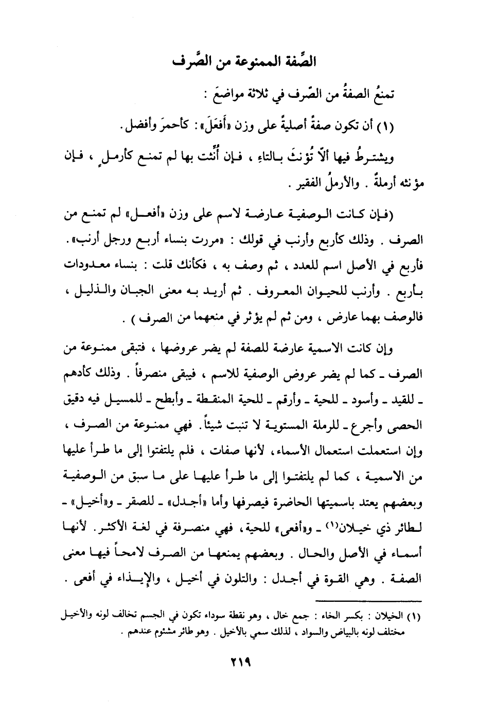 (فإن كانت الوصفية عارضة لاسم على وزن "أفعل" لم تمنع من الصرف. وذلك كأربع وأرنب في قولك "مررت بنساء أربع ورجل أرنب". فأربع في الأصل اسم للعدد، ثم وصف به، فكأنك قلت بنساء معدودات بأربع. وأرنب للحيوان المعروف. ثم أريد به معنى الجبان والذليل، فالوصف بهما عارض، ومن ثم لم يؤثر في منعهما من الصرف.