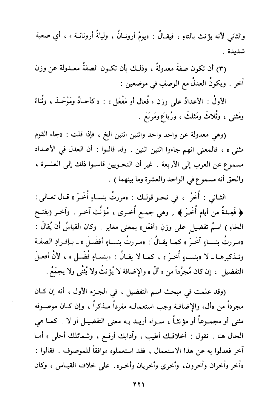 (وقد علمت في مبحث اسم التفضيل، في الجزء الأول، انه إن كان مجرداً من "أل" والإضافة وجب استعماله مفرداً مذكراً، وإن كان موصوفه مثنى أو مجموعاً أو مؤنثاً، سواء أريد به معنى التفضيل أولا. كما هي الحال هنا. تقول أخلاقك أطيب، وآدابك أرفع، وشمائلك أحلى" أما آخر فعدلوا به عن هذا الاستعمال، فقد استعملوه موافقاً للموصوف. فقالوا "آخر وآخران وآخرون، وأخرى وأخريان وأخر". على خلاف القياس، وكان