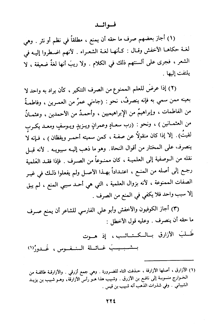 (3) أجاز الكوفيون والأخفش وأبو علي الفارسي للشاعر أن يمنع صرف ما حقه أن ينصرف. وعليه قول الأخطل [من الكامل]