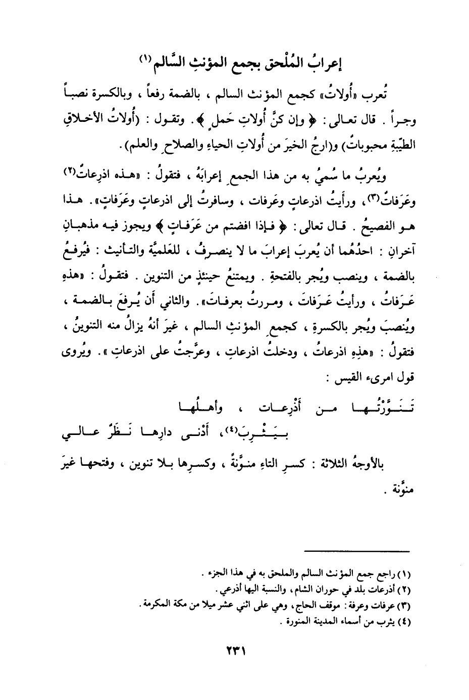 ويُعربُ ما سُميُ به من هذا الجمعِ إعرابَهُ، فتقولُ "هذه اذرِعاتٌ وعَرَفاتٌ، ورأَيتُ اذرعاتٍ وعَرفات، وسافرتُ إلى اذرعاتٍ وعَرَفاتٍ". هذا هو الفصيحُ. قال تعالى {فإذا افضتم من عَرَفاتٍ} ويجوز فيه مذهبانِ آخرانِ احدُهما أن يُعربَ إعرابَ ما لا ينصرفُ، للعَلميَّة والتأنيث فيُرفعُ بالضمة، وينصب ويُجر بالفتحةِ. ويمتنعُ حينئذٍ من التنوين. فتقولُ "هذهِ عَرَفاتُ، ورأَيتُ عرَفاتَ، ومررتُ بعرفاتَ". والثاني أَن يُرفعَ بالضمة، ويُنصبَ ويُجر بالكسرةِ، كجمعِ المؤنثِ السالم، غيرَ أنهُ يزالُ منه التنوينُ، فتقولُ "هذهِ اذرعاتُ، ودخلتُ اذرعاتِ، وعرَّجتُ على اذرعاتِ". ويُروى قول امرئ القيس [من الطويل]