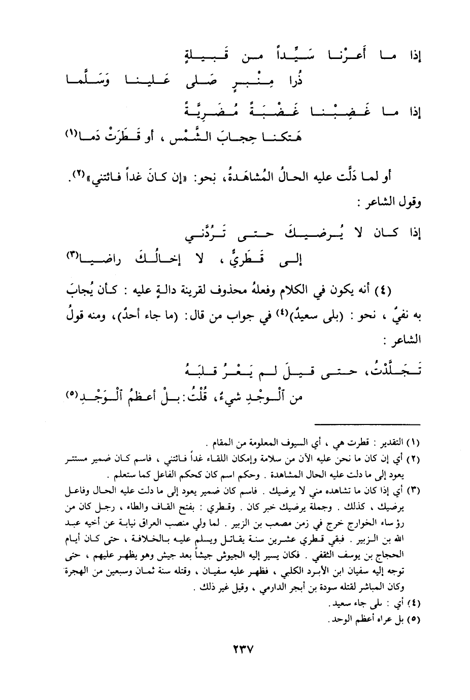 (4) أنه يكون في الكلام وفعلهُ محذوف لقرينة دالة عليه كأن يُجابَ به نفيٌ، نحو (بلى سعيدٌ) في جواب من قال (ما جاء أحدٌ) ، ومنه قولُ الشاعر [من الطويل]