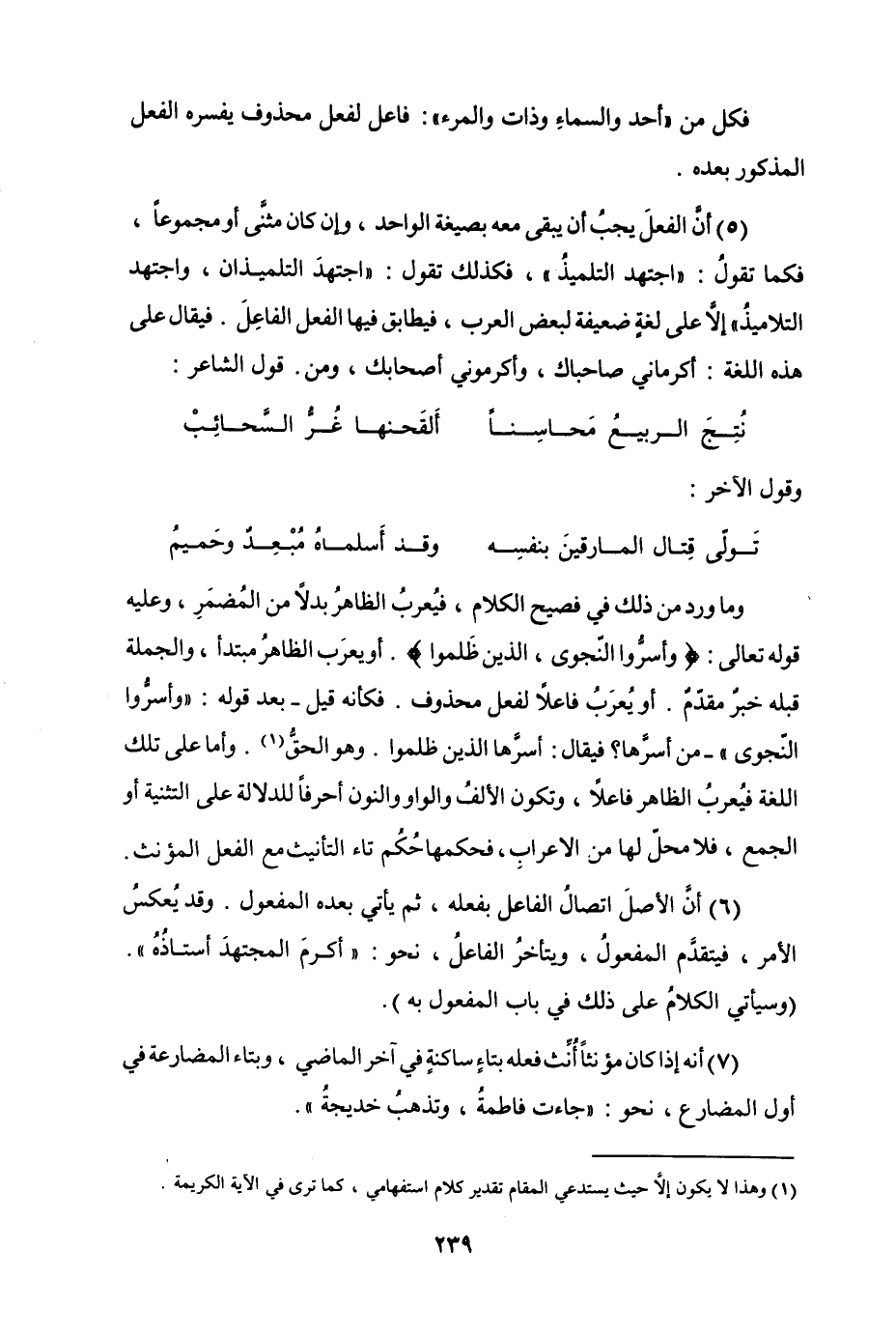 (5) أنَّ الفعلَ يجبُ أن يبقى معه بصيغة الواحد، وإن كان مثنَّى أو مجموعاً، فكما تقولُ "اجتهد التلميذُ"، فكذلك تقول "اجتهدَ التلميذان، واجتهد التلاميذُ" إلا على لغةٍ ضعيفة لبعض العرب، فيطابق فيها الفعل الفاعِلَ. فيقال على هذه اللغة أكرماني صاحباك، وأكرموني أصحابك، ومنه قول الشاعر [من مجزوء الكامل]