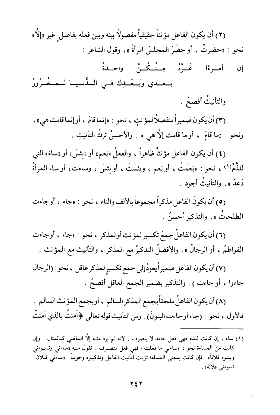 (8) أن يكون الفاعلُ ملحقاً بجمع المذكر السالم، وبجمع المؤنث السالم. فالأول، نحو (جاء أو جاءت البنونَ) .ومن التأنيث قوله تعالى: {آمَنتُ أَنَّهُ لا إله إِلاَّ الذي آمَنَتْ