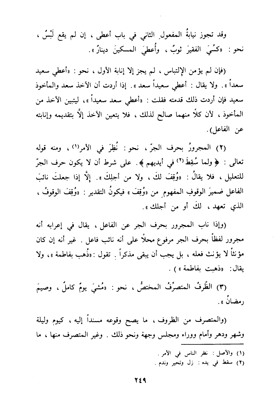 (2) المجرورُ بحرف الجرّ، نحو نُظِرَ في الامر، ومنه قوله تعالى "ولما سُقِطَ في أيديهم". على شرط أن لا يكون حرف الجرّ للتعليل، فلا يقالث "وُقِفَ لكَ، ولا من أجلِكَ". إلاّإذا جعلتَ نائبَ الفاعل ضميرَ الوقوفِ المفهوم من "وُقِفَ" فيكونُ التقدير "وُقِفَ الوقوفُ، الذي تعهد، لكَ أو من أجلك".