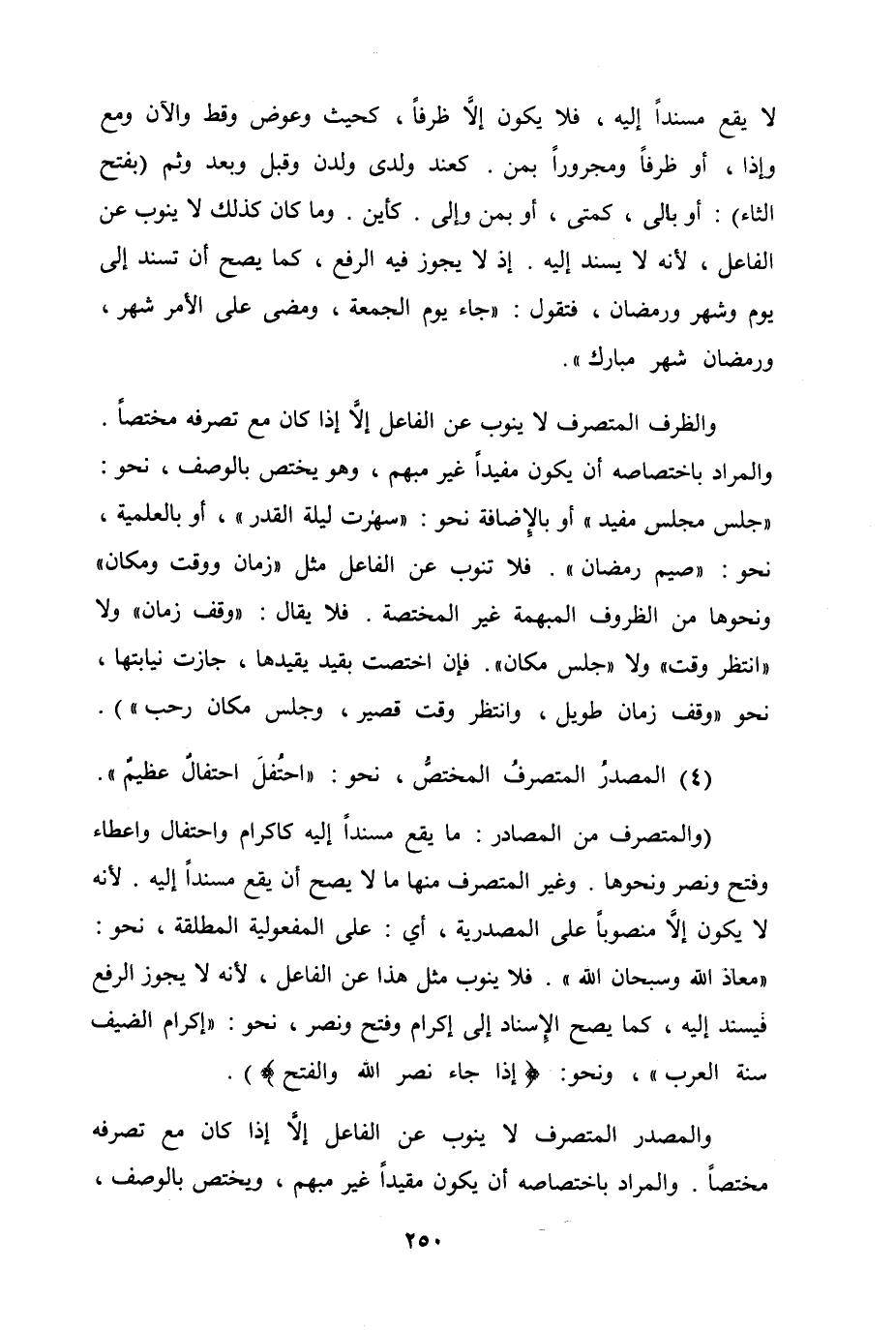 والظرف المتصرف لا ينوب عن الفاعل إلا اذا كان مع تصرفه مختصاً. والمراد باختصاصه ان يكون مفيداً غير مبهم، وهو يختص بالوصف، نحو "جلس مجلس مفيد" أو بالاضافة نحو "سهرت ليلة القدر"، أو بالعلمية، نحو "صيم رمضان". فلا تنوب عن الفاعل مثل "زمان ووقت ومكان" ونحوها من الظروف المبهمة غير المختصة. فلا يقال "وقف زمان" ولا "انتظر وقت" ولا "جلس مكان". فان اختصت بقيد يقيدها، جازت نيابتها، نحو "وقف زمان طويل، وانتظر وقت قصير، وجلس مكان رحب") .