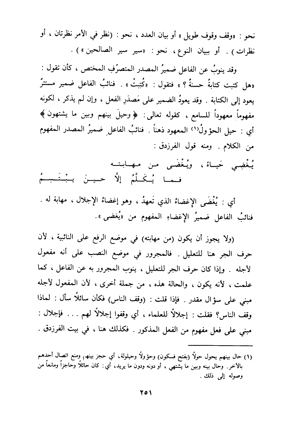 (ولا يجوز أن يكون (من مهابته) في موضع الرفع على النائبية، لان حرف الجرهنا التعليل. فالمجرور في موضع النصب على أنه مفعول لأجله. وإذا كان الجر التعليل، ينوب المجرور به عن الفاعل، كما عملت، لأنه يكون، والحالة هذه، من جملة أخرى، لأن المفعول لأجله مبني على سؤال مقدر. فاذا قلت (وقف الناس) فكأن سائلاً سأل لماذا وقف الناس؟ فقلت اجلالاً العلماء، أي وقفوا جلالاً لهم.... فاجلال مبني على فعل مفهوم من الفعل المذكور، فكذلك هنا، في بيت الفرزدق.