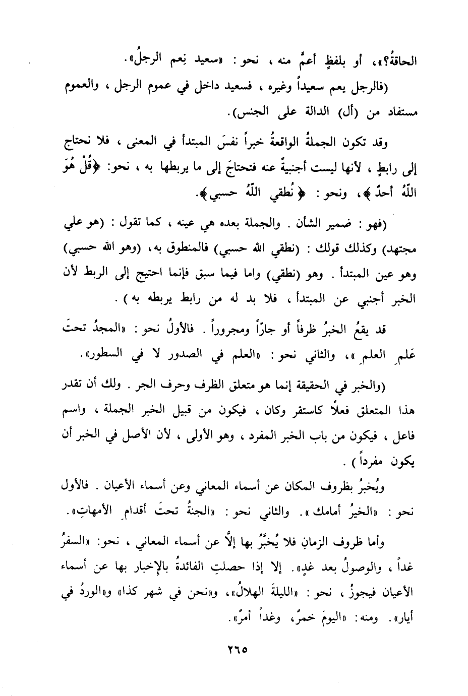 (والخبر في الحقيقة إنما هو متعلق الظرف وحرف الجر. ولك أن تقدر هذا المتعلق فعلاً كاستقر وكان، فيكون من قبيل الخبر الجملة، واسم فاعل، فيكون من باب الخبر المفرد، وهو الأولى، لأن الأصل في الخبر أن يكون مفرداً) .