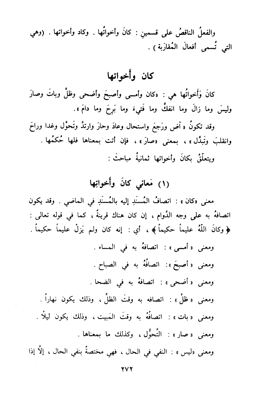 كانَ وأَخواتُها هي "كان وأمسى وأصبحَ وأضحى وظلَّ وباتَ وصارَ وليسَ وما زالَ وما انفكَّ وما فَتيءَ وما بَرِحَ وما دامَ".
