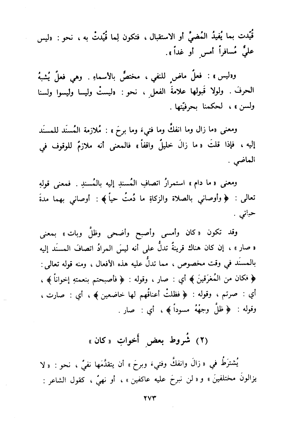 وقد تكون "كان وأمسى وأصبح واضحى وظلَّ وبات" بمعنى "صار"، إن كان هناك قرينةٌ تدلُّ على أنه ليسَ المرادُ اتصافَ المسنَد إليه بالمسنَد في وقت مخصوص، مما تدلُّ عليه هذه الأفعال، ومنه قوله تعالى {فكان من المُغرَقينَ} أي صار، وقوله {فأصبحتم بنعمتهِ إخواناً} ، أي صرتم، وقوله {فظلتْ أعناقُهم لها خاضعين} ، أي صارت، وقوله {ظلَّ وجهُهُ مسوداً} ، أي صار.