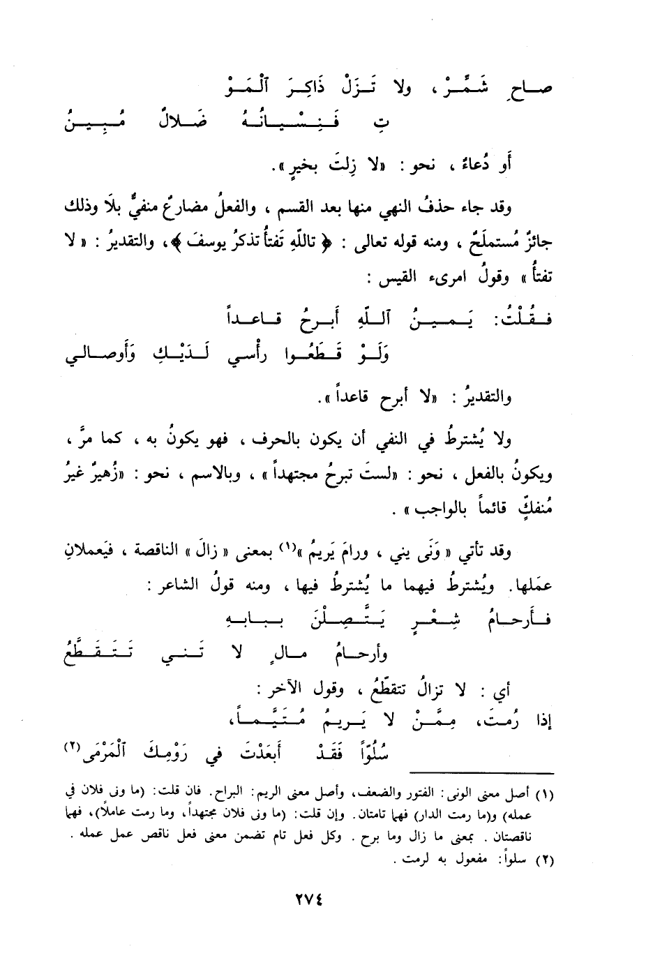 ولا يُشترطُ في النفي أن يكون بالحرف، فهو يكونُ به، كما مرَّ، ويكونُ بالفعل، نحو "لستَ تبرحُ مجتهداً"، وبالاسم، نحو "زُهيرٌ غيرُ مُنفكٍّ قائماً بالواجب".