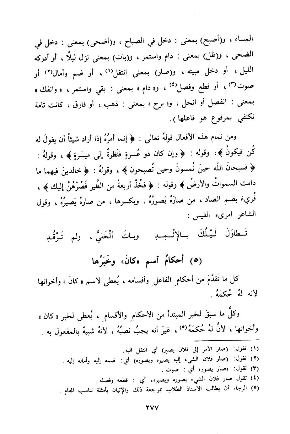 المساء، و (أصبح) بمعنى دخل في الصباح، و (أضحى) بمعنى دخل في الضحى، و (ظل) بمعنى دام واستمر، و (بات) بمعنى نزل ليلاً، أو أدركه الليل، أو دخل مبيته، و (صار) بمعنى انتقل، أو ضم وأمال أو صوت، أو قطع وفصل، و"دام" بمعنى بقي واستمر، "وانفك" بمعنى انفصل أو انحل، و"برح" بمعنى ذهب، أو فارق، كانت تامة تكتفي بمرفوع هو فاعلها) .