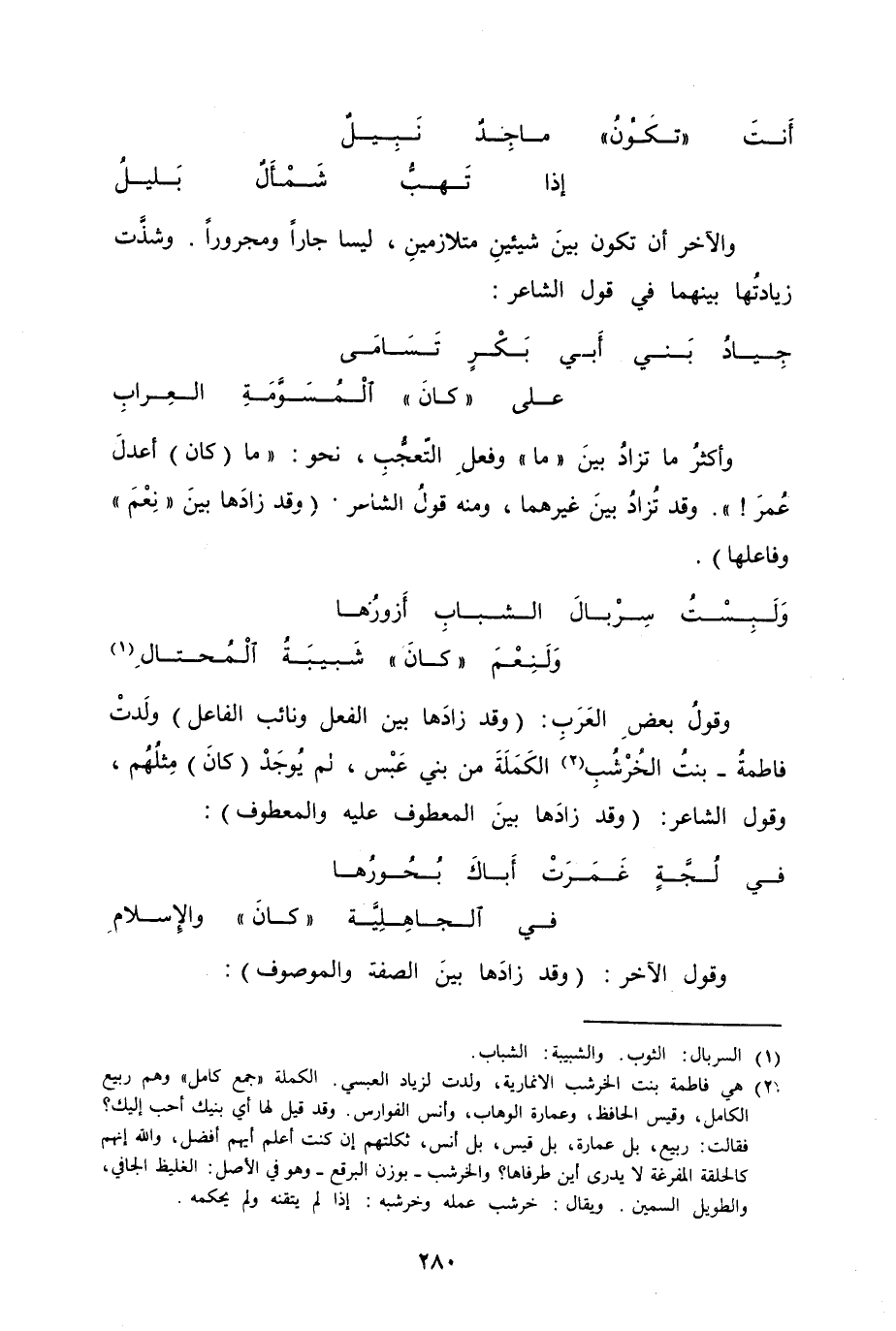 وقولُ بعضِ العرَبِ (وقد زادّها بين الفعل ونائب الفاعل) وَلَدتْ فاطمةُ - بنتُ الخُرْشُبِ الكَمَلةَ من بني عَبْس، لم يُوجَدْ (كانَ) مِثلُهُم، وقول الشاعر (وقد زادَها بينَ المعطوف عليه والمعطوف) [من الكامل]