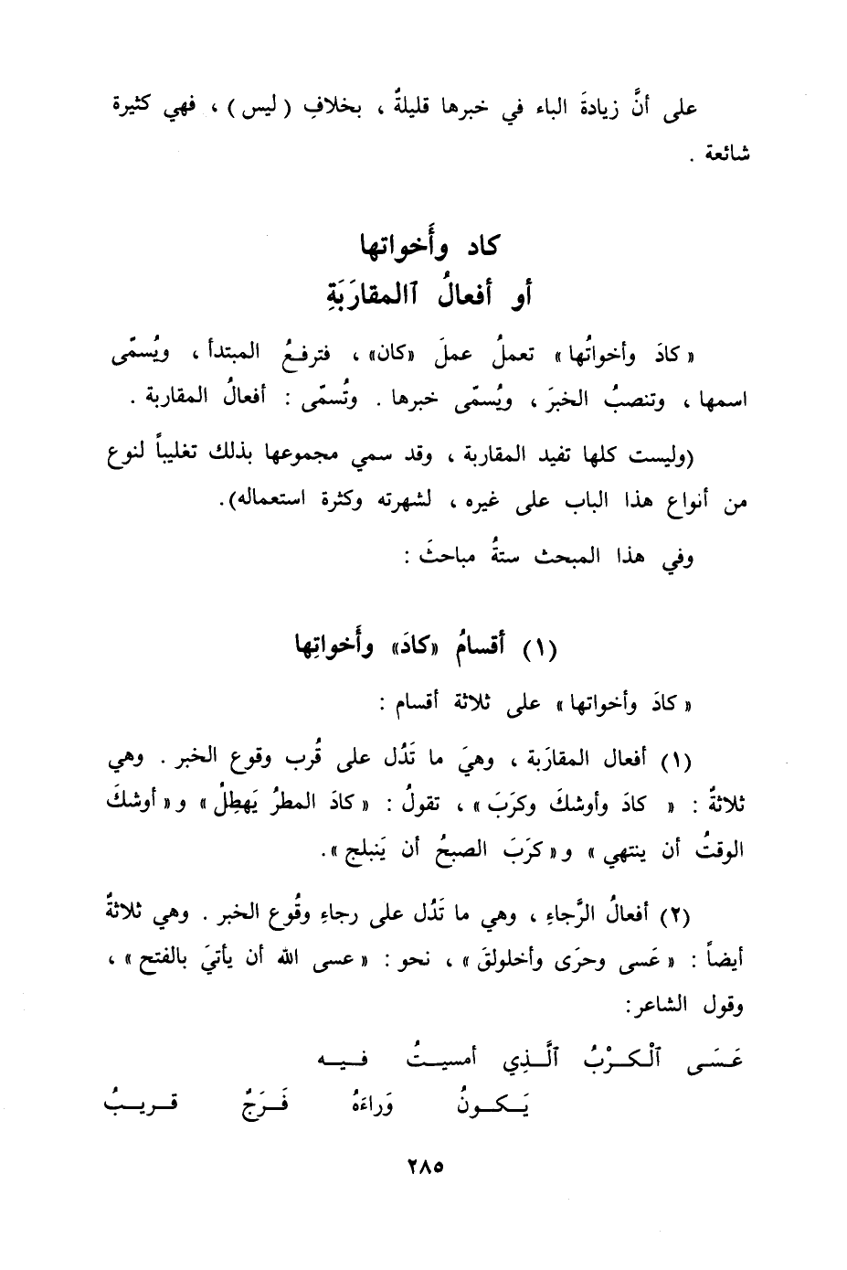 (1) افعال المقارَبة، وهيَ ما تَدُل على قُرب وقوع الخبر. وهي ثلاثةٌ "كادَ وأوشكَ وكرَبَ"، تقولُ "كادَ المطرُ يَهطِلُ" و"أوشكَ الوقتُ ان ينتهي" و"كرَبَ الصبحُ أن يَنبلج".