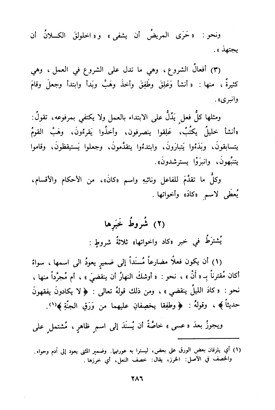 (2) ان يكون متأخراً عنها. ويجوزُ ان يتوسَّطَ بينها وبينَ اسمها، نحو "يكادُ ينقضي الوقتُ". ونحو "طَفِقَ ينصرفون الناسُ".
