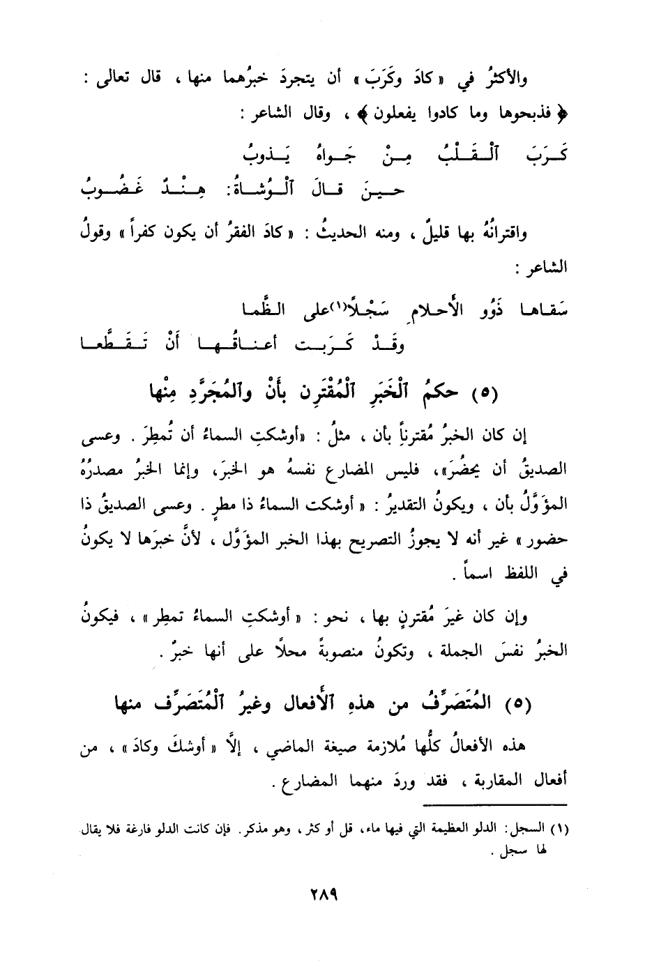 والأكثرُ في "كادَ وكَرَبَ" أن يتجردَ خبرُهما منها، قال تعالى {فذبحوها وما كادوا يفعلون} ، وقال الشاعر [من الخفيف]