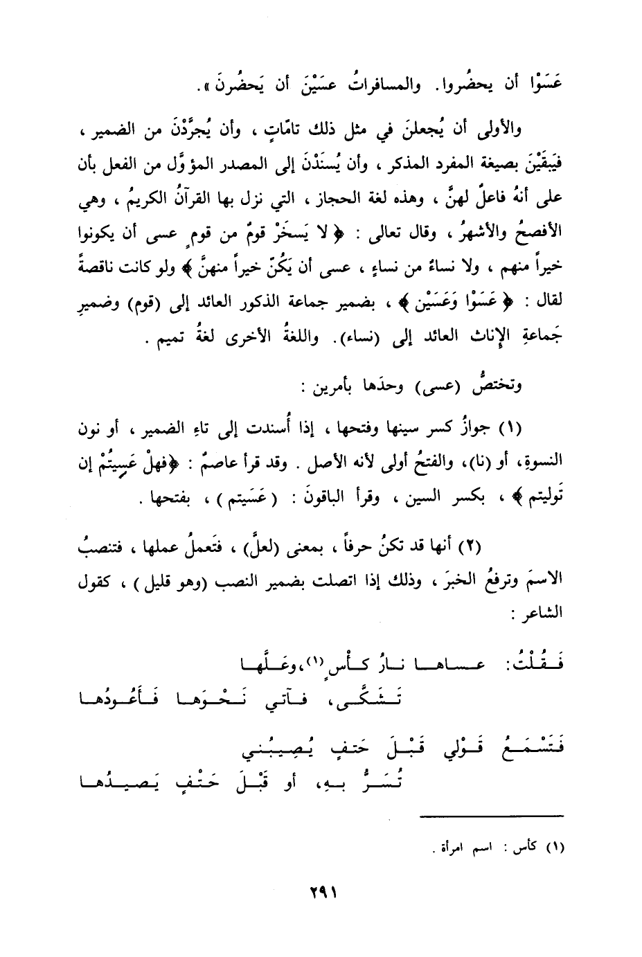 والأولى أن يُجعلنَ في مثل ذلك تامّاتٍ، وأن يُجرَّدْنَ من الضمير، فيَبقَيْنَ بصيغة المفرد المذكر، وأن يُسنَدْنَ الى المصدر المؤوَّل من الفعل بأن على أنهُ فاعلٌ لهنَّ، وهذه لغة الحجاز، التي نزل بها القرآنُ الكريمُ، وهي الأفصحُ والاشهرُ، وقال تعالى {لا يَسْخَرْ قومٌ من قومٍ عسى أن يكونوا خيراً منهم، ولا نساءٌ من نساءٍ، عسى ان يَكُنّ خيراً منهنَّ} ولو كانت ناقصةً لقال (عَسَوْا وعَسَيْن) ، بضمير جماعة الذكور العائد الى (قوم) وضميرِ جَماعةِ الإناث العائد الى (نساء) . واللغةُ الاخرى لغةُ تميم.