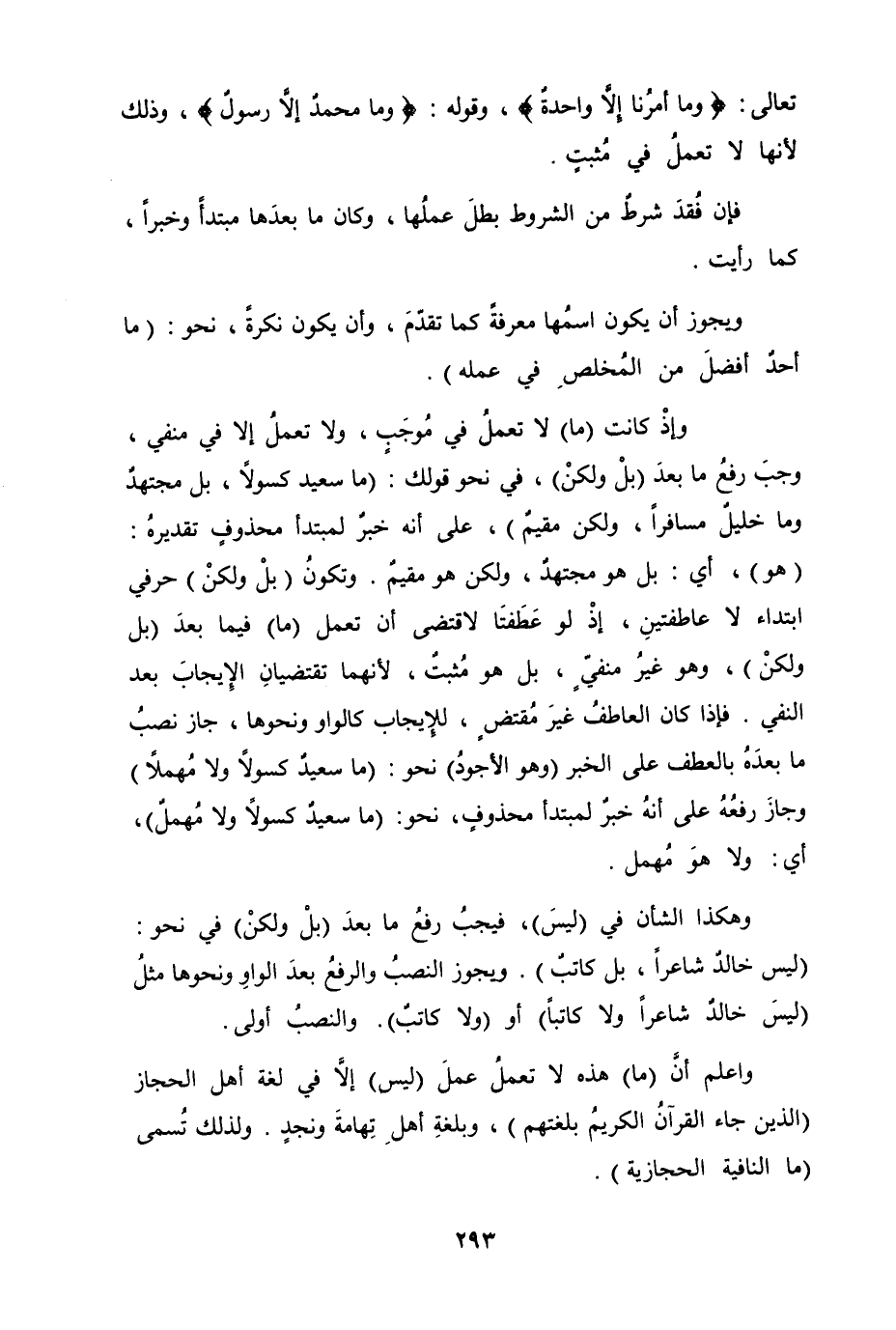 وإذْ كانت (ما) لا تعملُ في مُوجَبٍ، ولا تعملُ إلا في منفي، وجبَ رفعُ ما بعدَ (بلْ ولكنْ) ، في نحو قولك (ما سعيد كسولاً، بل مجتهدٌ وما خليلٌ مسافراً، ولكن مقيمٌ) ، على أنه خبرٌ لمبتدأ محذوفٍ تقديرهُ (هو) ، اي بل هو مجتهدٌ، ولكن هو مقيمٌ. وتكونُ (بلْ ولكنْ) حرفي ابتداء لا عاطفتينِ، إذْ لو عَطفَتا لاقتضى ان تعمل (ما) فيما بعدَ (بل ولكنْ) ، وهو غيرُ منفيٍّ، بل هو مُثبتٌ، لأنهما تقتضيانِ الايجابَ بعد النفي. فاذا كان العاطفُ غيرَ مُقتضٍ، للايجاب كالواو ونحوها، جاز نصبُ ما بعدَهُ بالعطف على الخبر (وهو الاجودُ) نحو (ما سعيدٌ كسولاً ولا مُهملاً) وجازَ رفعُهُ على انهُ خبرٌ لمبتدأ محذوفٍ، نحو (ما سعيدٌ كسولاً ولا مُهملٌ) ، اي ولا هوَ مُهمل.