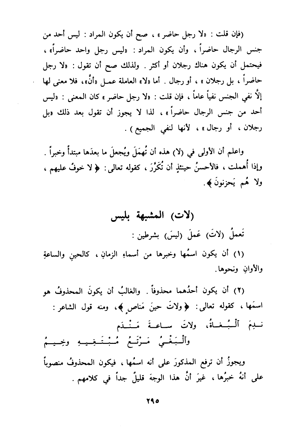 (فان قلت "لا رجل حاضر". صح أن يكون المراد ليس احد من جنس الرجال حاضراً، وأن يكون المراد "ليس رجل واحد حاضراً". فيحتمل أن يكون هناك رجلان أو أكثر. ولذلك صح أن تقول "لا رجل حاضراً، بل رجلان"، أو رجال. أما "لا" العاملة عمل "أنَّ"، فلا معنى لها إلا نفي الجنس نفياً عاماً، فان قلت "لا رجل حاضر" كان المعنى "ليس أحد من جنس الرجال حاضراً"، لذا لا يجوز أن تقول بعد ذلك "بل رجلان، أو رجال"، لأنها لنفي الجميع) .