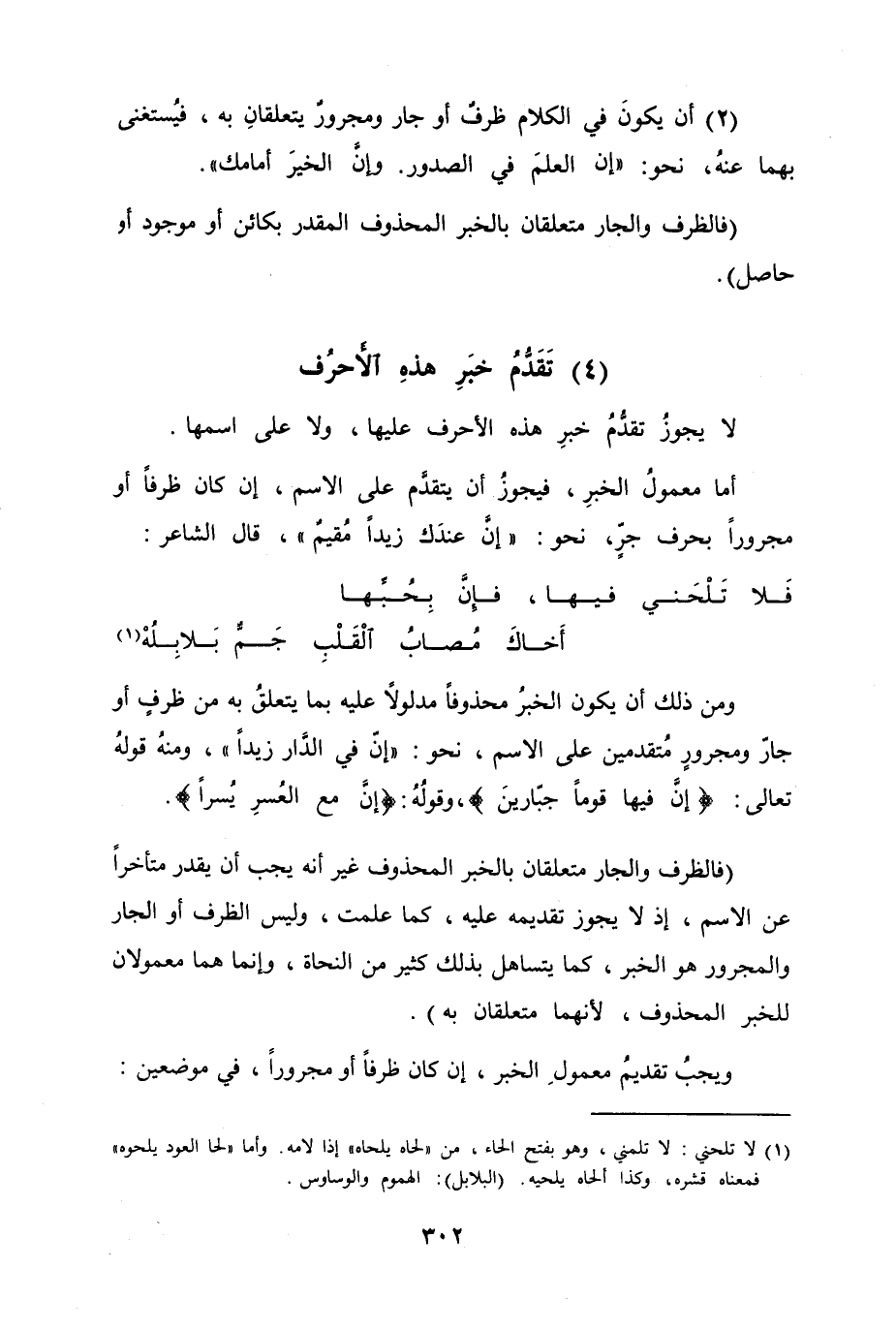 ومن ذلك أن يكون الخبرُ محذوفاً مدلولاً عليه بما يتعلقُ به من ظرفٍ مأو جارٍّ ومجرورٍ مُتقدمين على الاسم، نحو "إنَّ في الدَّار زيداً"، ومنهُ قولهُ تعالى "إنَّ فيها قوماً جبّارينَ، وقولهُ "إنَّ مع العُسرِ يُسراً".