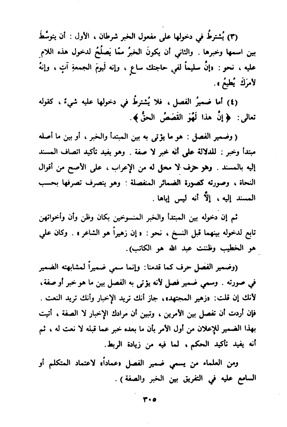 (وضمير الفصل حرف كما قدمنا وإنما سمي ضميراً لمشابهته الضمير في صورته. وسمي ضمير فصل لأنه يؤتى به الفصل بين ما هو خبر أو صفة، لأنك إن قلت "زهير المجتهد"، جاز أنك تريد الإخبار وأنك تريد النعت. فان أردت أن تفصل بين الأمرين. وتبين أن مرادك الإخبار لا الصفة. أتيت بهذا الضمير للاعلان من أول الأمر بأن ما بعده خبر عما قبله لا نعت له، ثم انه يفيد تأكيد الحكم، لما فيه من زيادة الربط.