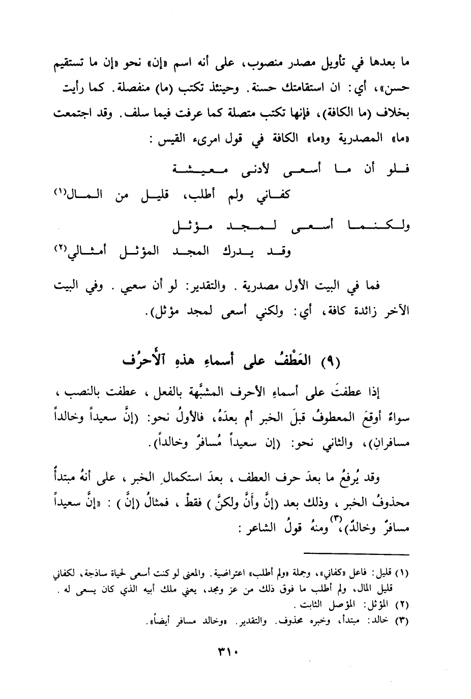 فما في البيت الاول مصدرية. والتقدير لو ان سعيي. وفي البيت الآخر زائدة كافة، أي ولكني أسعى لمجد مؤثل) .