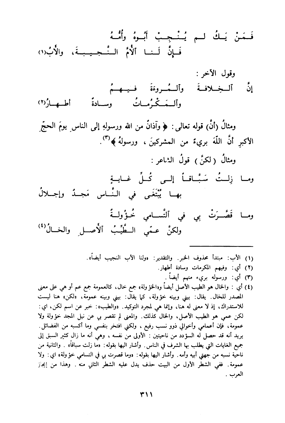 فَمَنْ يَكُ لم يُنْجِبْ أَبُوهُ وأُمُّهُ ... فَإنَّ لَنا الأُمَّ النَّجيةَ، والأَبُ