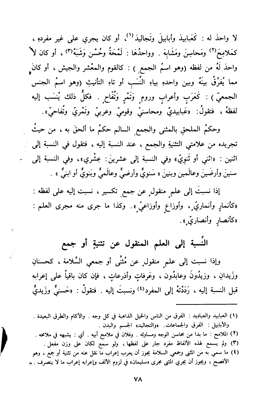 لا واحدَ له كعَبابيدَ وأبابيلَ وتَجاليدَ، أو كان يجري على غير مفردهِ، كمَلامِحَ ومَحاسِنَ ومَشابِهَ. وواحدُها لَمْحةٌ وحُسْن وَشبَهٌ، أو كان لا واحدَ لهُ من لفظه (وهو اسمُ الجمعِ) كلاقوم والمعْشر والجيش، أو كان مما يُفرَّقُ بينَهُ وبين واحدهِ بياءِ النَّسَبِ أو تاءِ التأنيثِ (وهو اسمُ الجنس الجمعيّ) كعَرَبٍ وأعرابِ ورومٍ وتَمْرٍ وتُفْاحٍ. فكلُّ ذلك يُنسَب إليه لفظهُ، فتقولُ "عَبابيديّ ومحاسنيّ وقوميّ وعربيّ وتَمْريّ وتُفاحيّ".