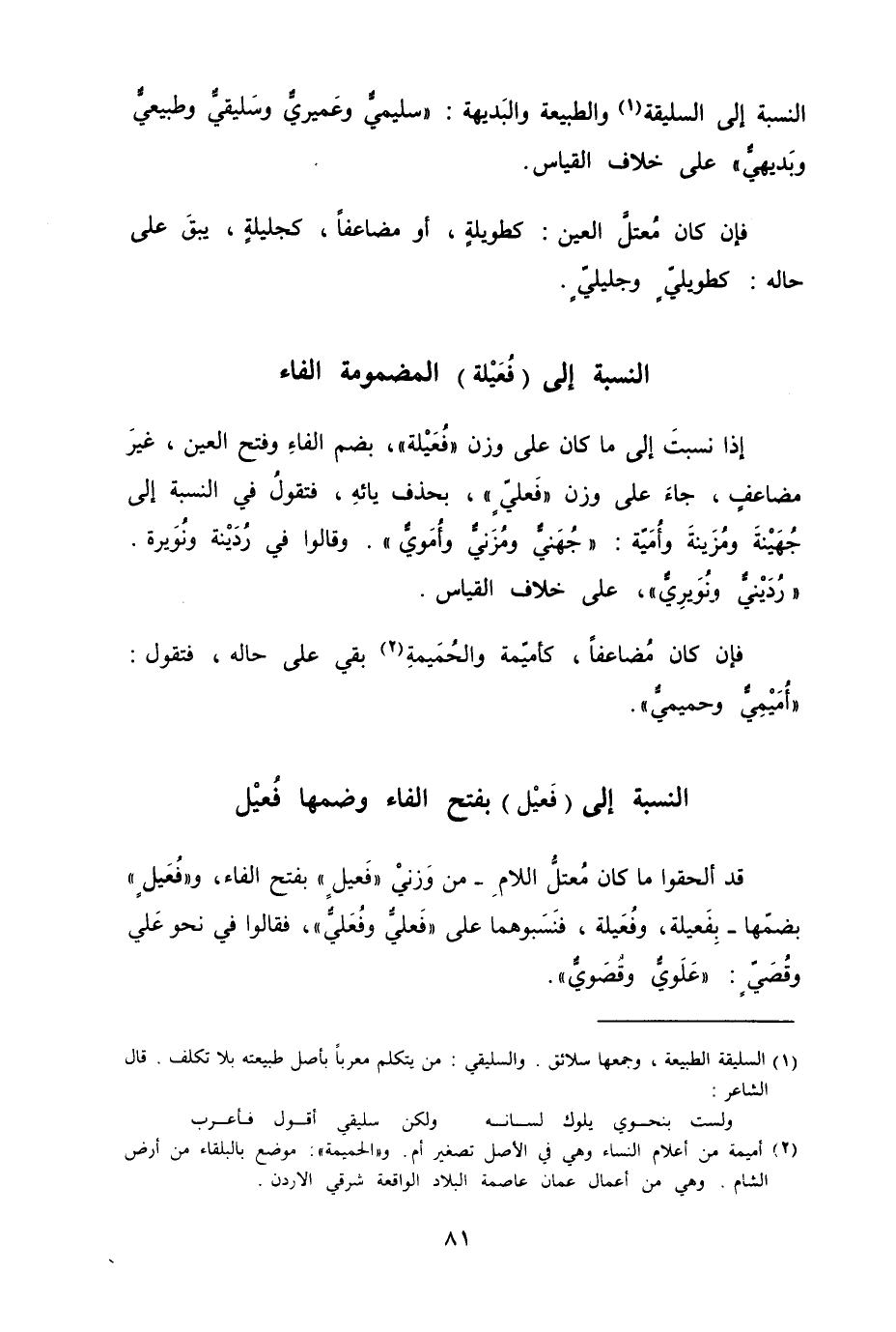 النسبة إلى السليقة والطبيعة والبَديهة "سليميٌّ وعَميريٌّ وسَليقيٌّ وطبيعيٌّ وبَديهيٌّ" على خلاف القياس.