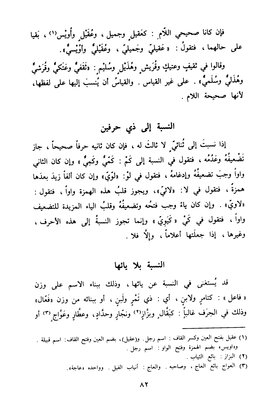 فإن كان صحيحي اللاّمِ كَعقيلٍ وجميل، وعُقَيْلٍ وأُوُيْس، بَقيا على حالها، فتقولُ "عَقيليّ وجَميليّ، وعُقَيْليٌّ وأوُيْسيٌّ".