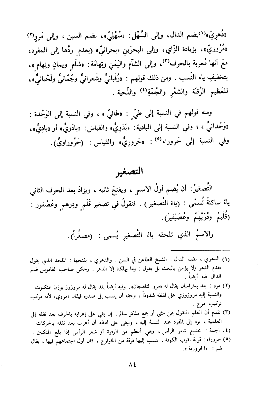 "دُهرِيّ" بضم الدال، وإلى السَّهْل "سُهْليّ"، بضم السين، وإلى مَروٍ "مرْوزيّ"، بزيادة الزّاي، وإلى البحرَينِ "بحرانيّ" (بعدمِ رَدَّها إلى المفرد، معَ أنها مُعربة بالحرف، وإلى الشآم واليَمَنِ وتِهامةَ "شآمٍ ويمانٍ وتِهامٍ"، بتخفيفِ ياء النّسب. ومن ذلك قولهم "رُقَبانيٌّ وشَعرانيٌّ وجُمّانيٌّ ولَحْيانيٌّ"، للعَظيم الرَّقبةَ والشَعرِ والجُمّةِ واللّحية.
