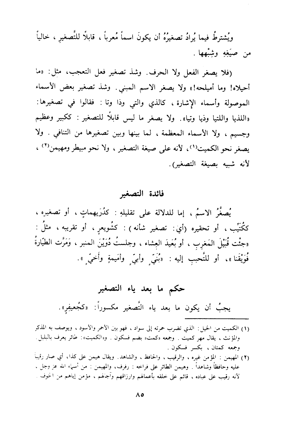(فلا يصغر الفعل ولا الحرف. وشذ تصغير فعل التعجب. مثل "ما احيلاه! وما اميلحه! "، ولا يصغر الاسم المبني. وشذ تصغير بعض الأسماء الموصولة وأسماء الإشارة، كالذي والتي وذا وتا فقالوا في تصغيرها "اللذيا واللتيا وذيا وتيا". ولا يصغر ما ليس قابلا للتصغير ككبير وعظيم وجسيم، ولا الأسماء المعظمة، لما بينها وبين تصغيرها من التنافي. ولا يصغر نحو الكميت، لأنه على صيغة التصغير، ولا نحو مبيطر ومهيمن، لأنه شبيه بصيغة التصغير) .