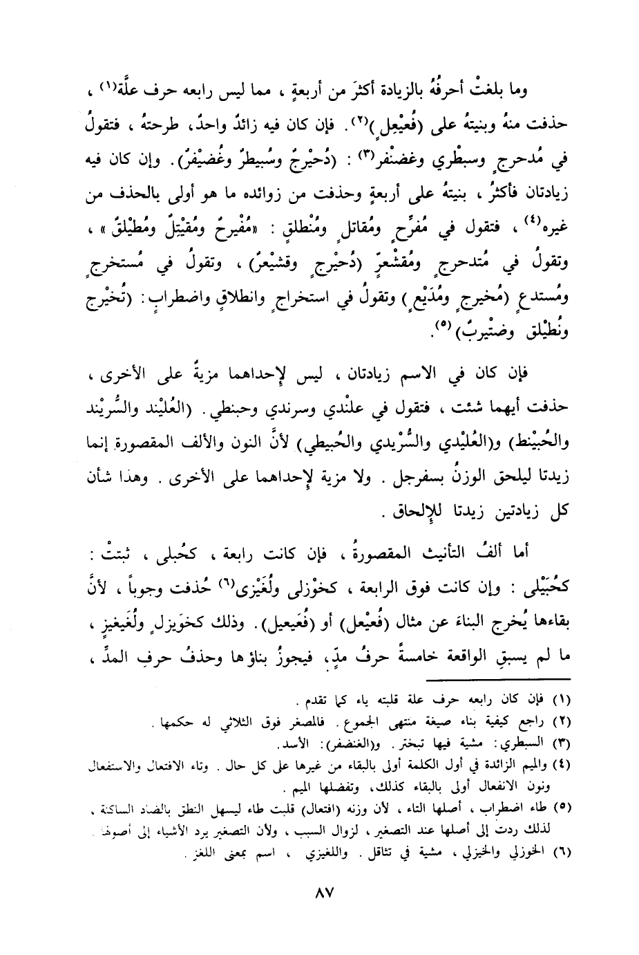 وما بلغتْ أحرُفهُ بالزيادة أكثرَ من أربعةٍ، مما ليس رابعه حرف علَّة، حذفت منهُ وبنيتهُ على (فُعيْعِلٍ) . فإن كان فيه زائدٌ واحدٌ، طرحتهُ، فتقولُ في مُدحرجٍ وسبطْري وغضنْفر (دُحيْرجٌ وسُبيطرٌ وغُضيْفرٌ) . وإن كان فيه زيادتان فأكثرُ، بنيتهُ على أربعةٍ وحذفت من زوائده ما هو أولى بالحذف من غيره، فتقول في مُفرِّحٍ ومُقاتلٍ ومُنْطلقٍ "مُفيْرحٌ ومُقيْتِلٌ ومُطيْلقٌ"، وتقولُ في مُتدحرجٍ ومُقشْعرٍّ (دُحيْرجٍ وقشيْعرٌ) ، وتقولُ في مُستخرجٍ ومُستدعٍ (مُخيرجٍ ومُدَيْعٍ) وتقولُ في استخراجِ وانطلاقٍ واضطرابٍ (تُخيْرج ونُطيْلق وضتيْربٌ) .