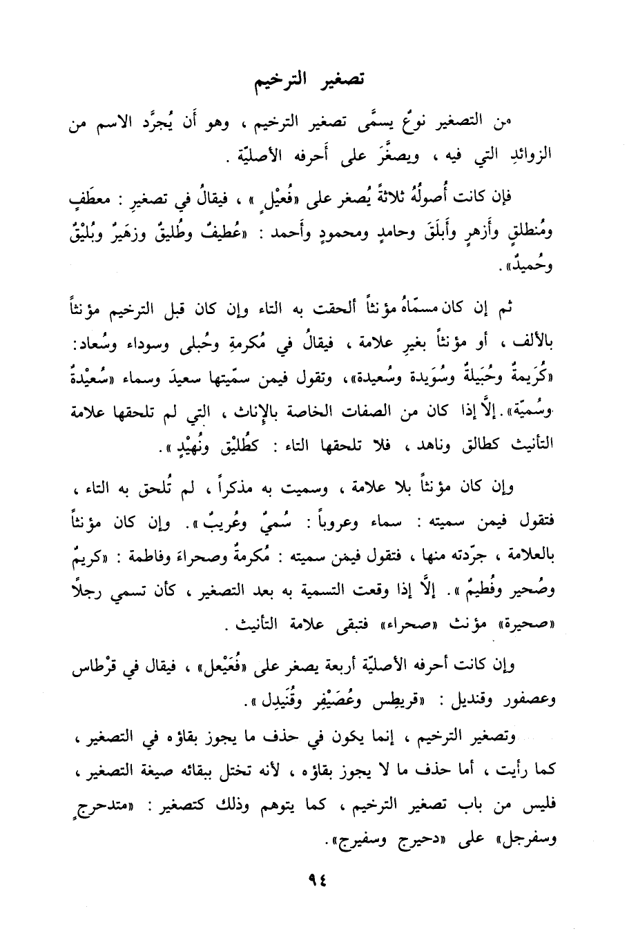 ثم إن كان مسمّاهُ مؤنثاً ألحقت به التاء وإن كان قبل الترخيم مؤنثاً بالألف، أَو مؤنثاً بغيرِ علامة، فيقالُ في مُكرمةِ وحُبلى وسوداء وسُعاد: "كُرَيمةٌ وحُجَيلةٌ وسُوَيدة وسُعيدة"، وتقول فيمن سمّيتها سعيدَ وسماء "سُعيْدةٌ وسُميّة". إلا إذا كان من الصفات الخاصة بالإناث، التي لم تلحقها علامة التأنيث كطالق وناهد، فلا تلحقها التاء كطُليْق ونُهيْدٍ".