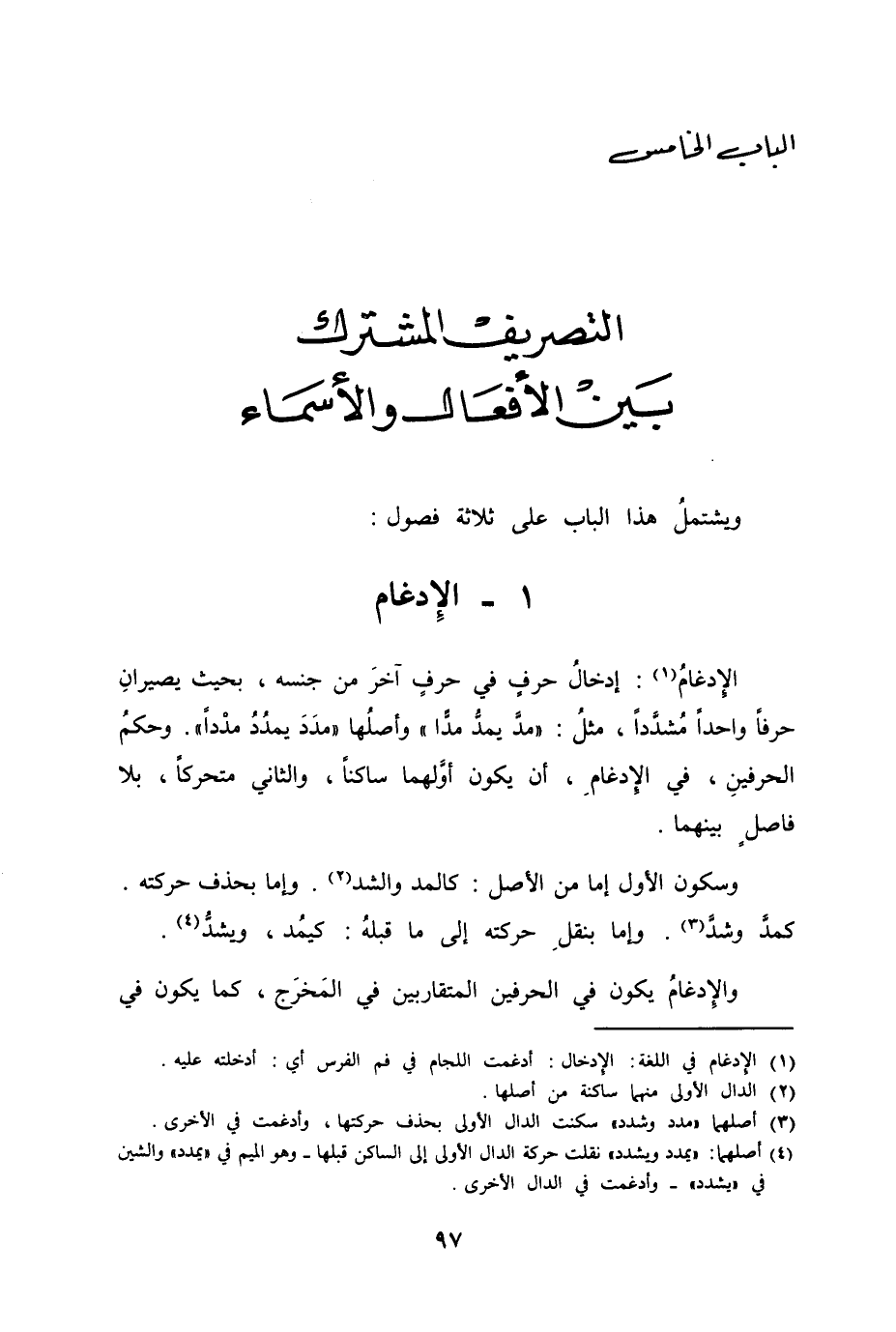 الإدغامُ إِدخالُ حرفٍ في حرفٍ آخرَ من جنسه، بحيث يصيرانِ حرفاً واحداً مُشدَّداً، مثلُ "مدَّ يمدُّ مدّاً" وأصلُها "مدَدَ يمدُدُ مدْداً". وحكمُ الحرفينِ، في الإدغامِ، أن يكون أوَّلهما ساكناً، والثاني متحركاً، بلا فاصلٍ بينهما.