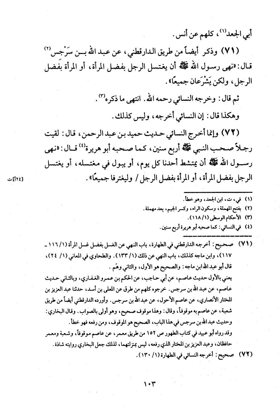 (71) وَذكر أَيْضا من طَرِيق الدَّارَقُطْنِيّ، عَن عبد الله بن سرجس قَالَ: " نهى رَسُول الله - صَلَّى اللَّهُ عَلَيْهِ وَسَلَّم َ - أَن يغْتَسل الرجل بِفضل الْمَرْأَة، أَو الْمَرْأَة بِفضل الرجل، وَلَكِن يشركان جَمِيعًا ".