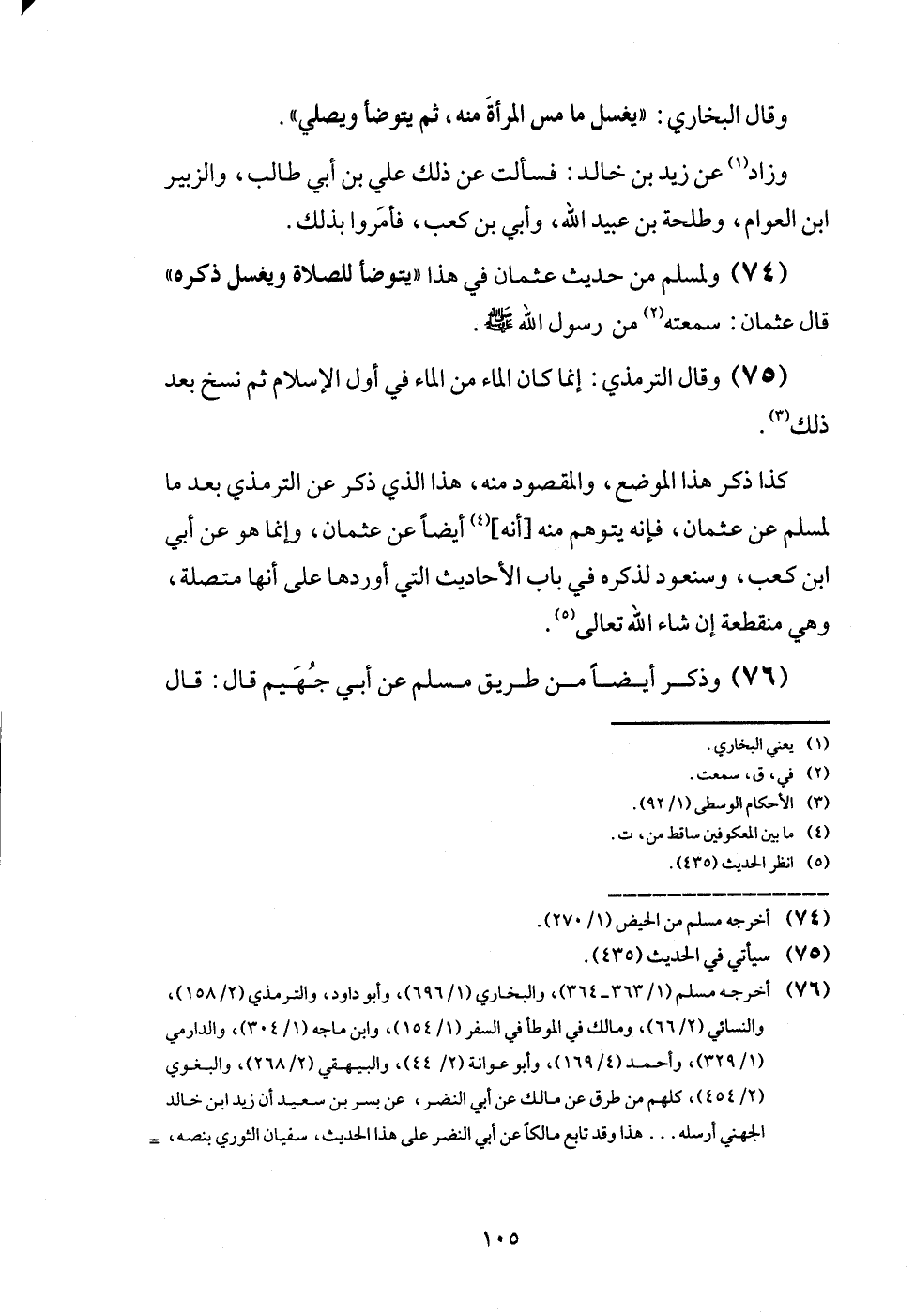 (74) وَلمُسلم من حَدِيث عُثْمَان فِي هَذَا " يتَوَضَّأ للصَّلَاة وَيغسل ذكره " قَالَ عُثْمَان: سمعته من رَسُول الله - صَلَّى اللَّهُ عَلَيْهِ وَسَلَّم َ -.