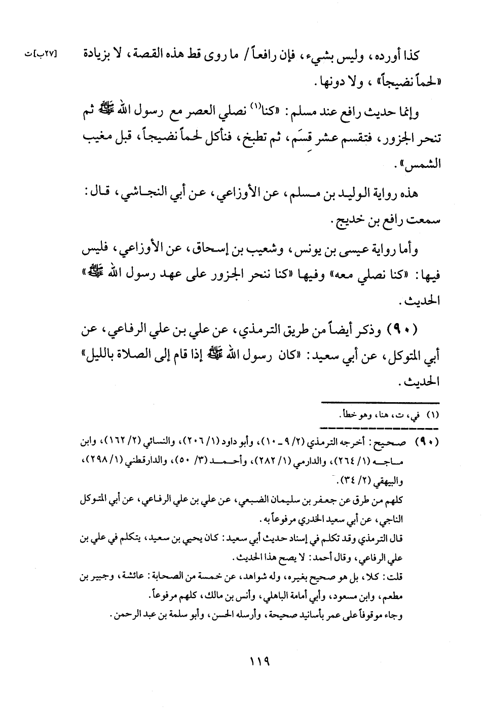 وَإِنَّمَا حَدِيث رَافع عِنْد مُسلم: " كُنَّا نصلي الْعَصْر مَعَ رَسُول الله - صَلَّى اللَّهُ عَلَيْهِ وَسَلَّم َ - ثمَّ تنحر الْجَزُور، فتقسم عشر قسم، ثمَّ تطبخ، فنأكل لَحْمًا نضيجاً، قبل مغيب الشَّمْس ". هَذِه رِوَايَة الْوَلِيد بن مُسلم، عَن الْأَوْزَاعِيّ، عَن أبي النَّجَاشِيّ، قَالَ: سَمِعت رَافع بن خديج.