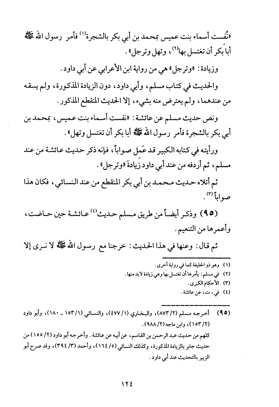 وَنَصّ حَدِيث مُسلم عَن عَائِشَة: " نفست أَسمَاء بنت عُمَيْس، بِمُحَمد بن أبي بكر بِالشَّجَرَةِ فَأمر رَسُول الله - صَلَّى اللَّهُ عَلَيْهِ وَسَلَّم َ - أَبَا بكر أَن تَغْتَسِل وتهل ".